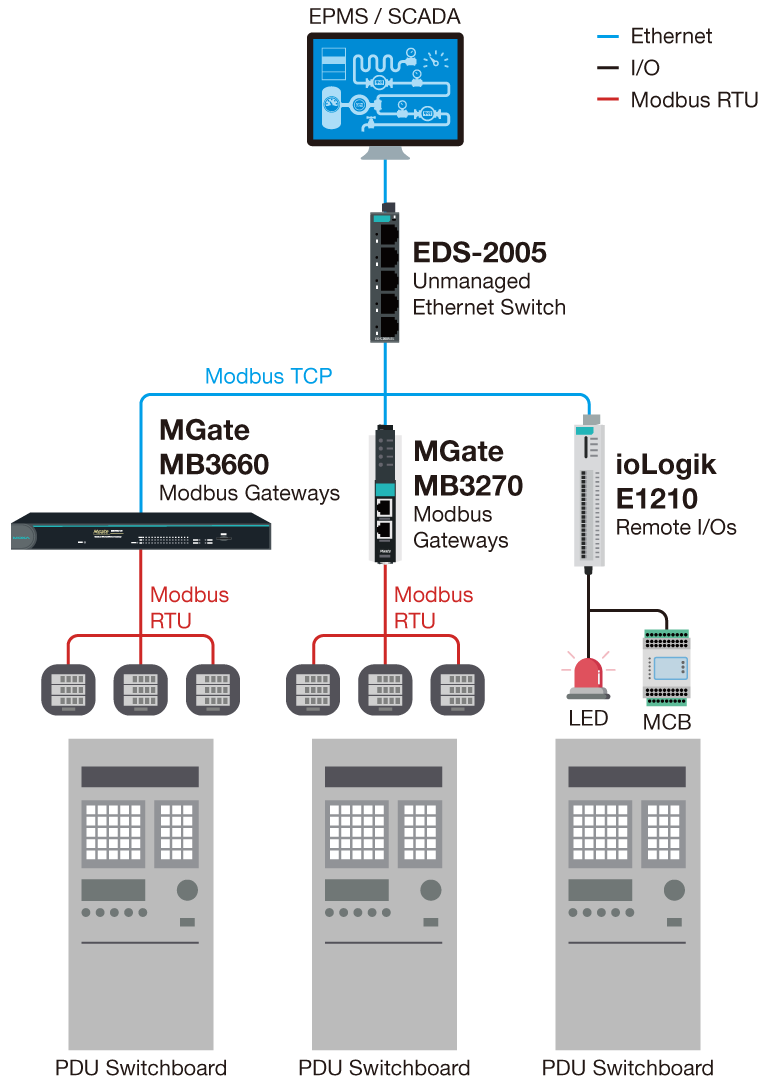 PDU(전력 분배 장치) 모니터링과 운영 효율을 위해, Moxa는 PDU 및 STS(정전 시 자동 절체 스위치)의 데이터를 EPMS·SCADA로 원활히 통합하는 완전한 연결성 솔루션을 제공.