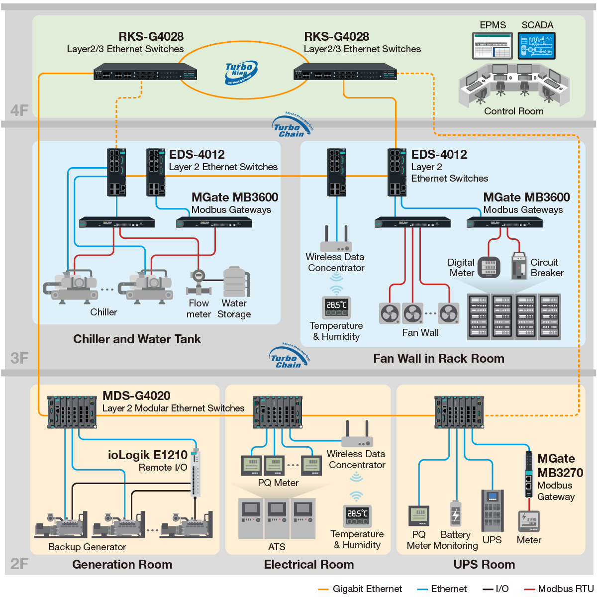 가용성을 극대화하기 위해 Moxa는 EPMS와 SCADA를 위한 단일 통합 네트워크 인프라 제공. 전력·냉각·환경 설비 전반의 안정적인 연결, 실시간 데이터 수집, 통합 모니터링 지원.