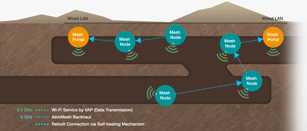 Moxa AeroMesh의 자가 형성(Self-forming) 기술은 배선이 어려운 구역에서 메쉬 네트워크를 위해 최적의 무선 경로를 지능적으로 탐색·구성하여 백홀 구축의 배선 비용과